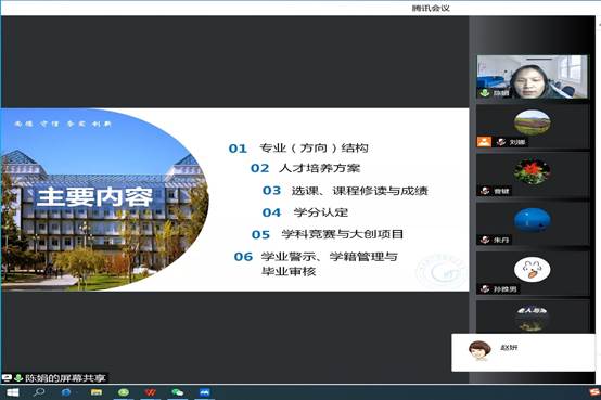 陈娟副院长从专业(方向)结构、人才培养方案、选课以及课程修读与成绩、学风认定、学科竞赛与大创项目、学业警示以及学籍管理与毕业审核6大项涵盖学生从入校到毕业的学业相关规定,进行了精心的准备、详细的解读和系统的梳理。陈院长指出学生学业问题是庞大的体系,是关系到学生学业完成顺利毕业的重要方面,作为班主任和辅导员与学生联系紧密,要及时关注、精准帮助、有效推动。同时,根据不同年级的学业特点,陈娟副院长给出了中肯的工作建议。会上,还就班主任、辅导员提出的日常工作中遇到的学生学业问题进行了耐心解答。