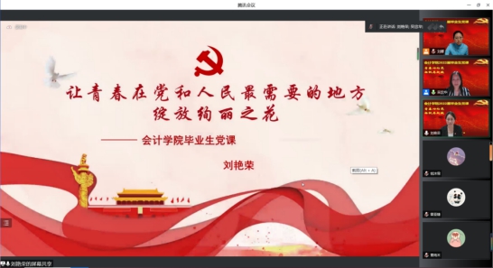 党委书记刘艳荣为全体毕业生党员带来了“让青春在党和人民最需要的地方绽放绚丽之花”的温暖而有力量的主题党课,围绕“心有所信,方能远行”、“对党忠诚,积极工作”、“尚德守信,涵养品行”三个方面讲授,结合各个时代鲜活的英雄事迹、身边党员故事以及校友的奋斗经历,分享了习近平总书记对青年大学生的勉励和殷切希望,还对毕业生党员进行了党风廉政教育。号召毕业生党员要坚定理想信念、牢记使命担当,为祖国的未来不断奋斗,为国家发展、民族复兴不断奉献,早日成为各行各业的中坚力量;不断提升品德修养、拥有幸福生活,让青春在党和人民最需要的地方绽放绚丽之花。