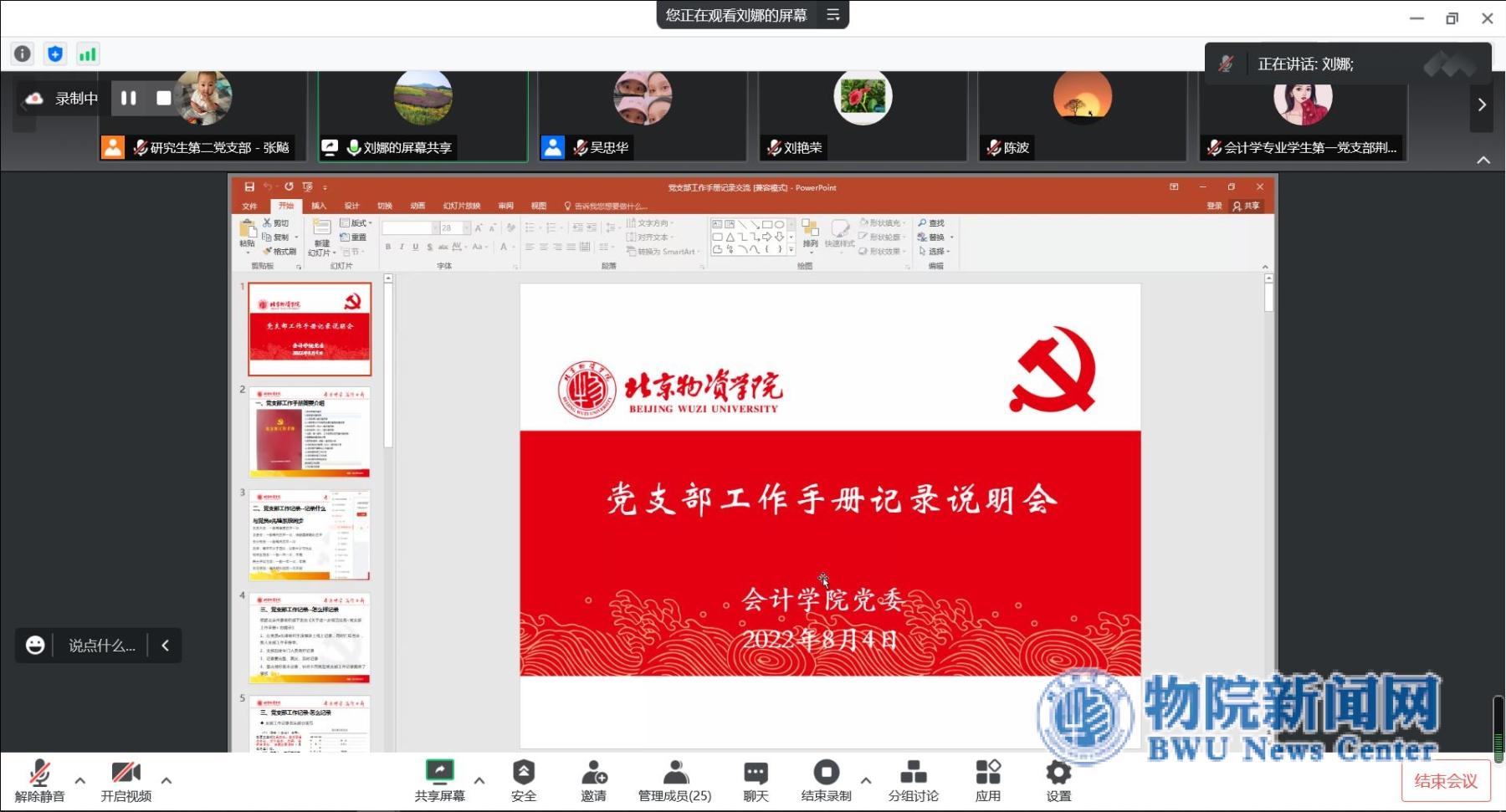 随后,刘艳荣书记对《党支部工作手册》记录及管理相关工作提出四点要求。一是要真实、及时、认真记录,确保支部工作和活动的完整呈现;二是要掌握记录要点和要素的完整性,既不过于繁杂也不能重要信息记录不全;三是要注意“三会一课”和支部各项活动开展的规范性要求。四是要充分发挥通知文件中记录模板的参考作用,按照模板要求及时整理。刘书记还强调各支部书记、支部委员要不断加强学习,了解规范要求和标准,提高工作效率,提高党支部工作质量,做党支部工作的“行家里手”。