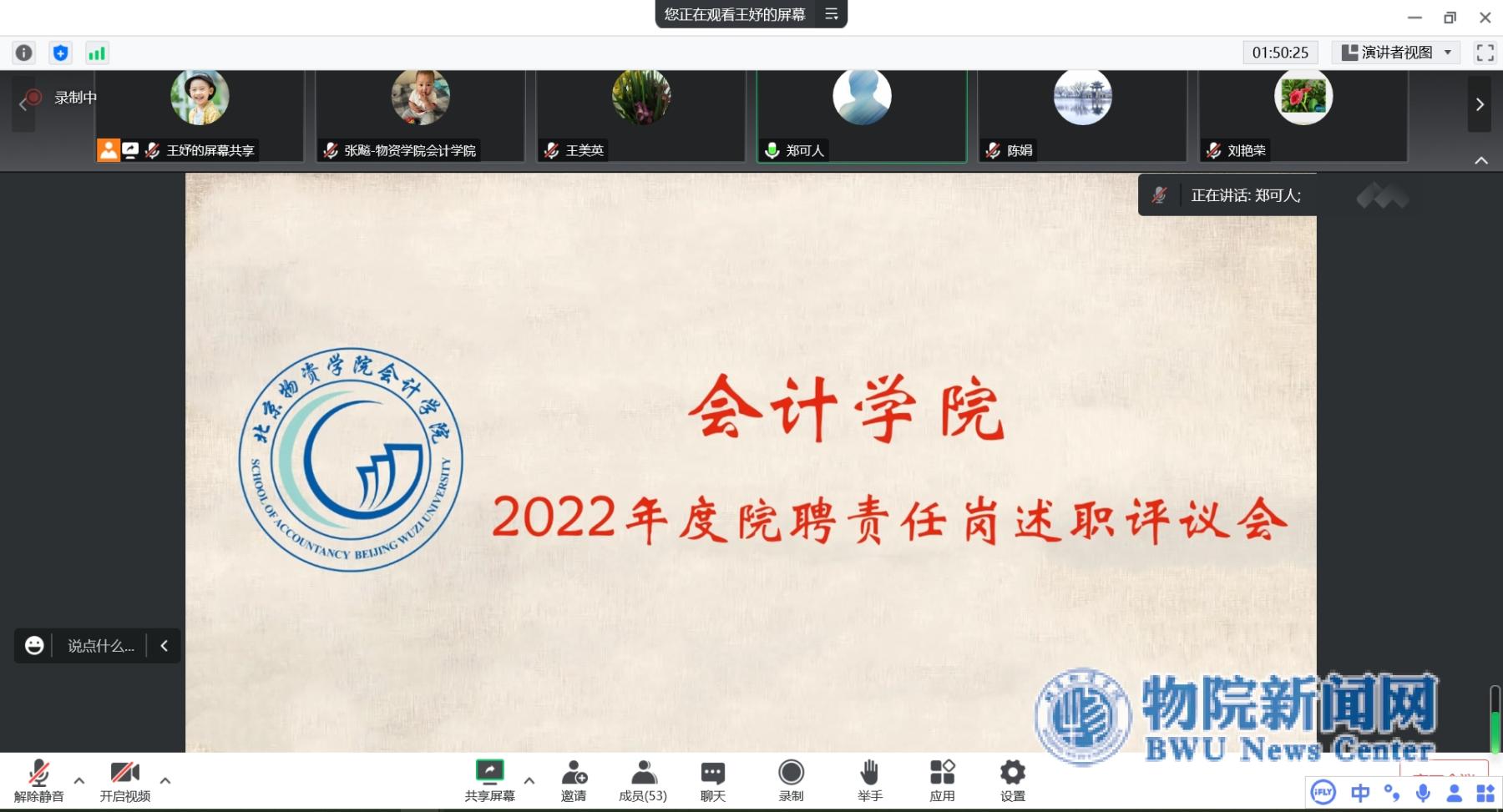 在线上召开2022年度院聘责任岗述职评议会。学院全体教职工参加会议,会议由陈娟副院长主持。