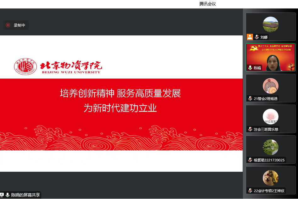 在对党的二十大报告学习中,陈娟副院长重点选取二十大报告中的新变化,强调科教兴国战略,提出互动问题:新发展理念是什么?新发展格局是什么?高质量发展是什么?同学们围绕问题在聊天区积极互动回答。同时引发同学去思考作为当代大学生,应该如何发挥自己的知识和能力,去服务于祖国的高质量发展。