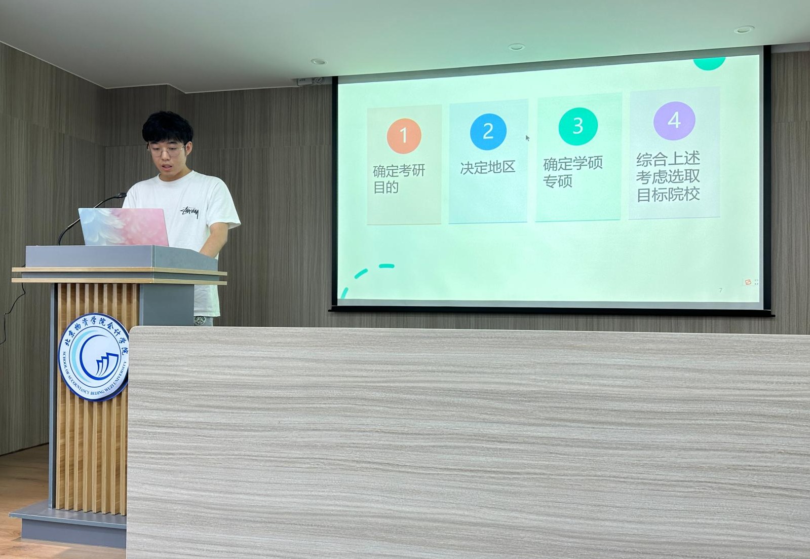 22级专硕4班班长李甄结合自己入学近一年的所思所想,分享了自己当年考研的相关经验和研究生学习生活的感悟。李甄主要针对如何合理选择考研院校和制定备考策略进行了介绍,李甄认为考研之路贵在坚持,勉励同学们要以积极心态备考,不松懈,不放弃。同时,李甄表示思考能力是研究生十分重要的能力,希望同学们在日常学习生活中养成主动思考、勤于思考的好习惯。