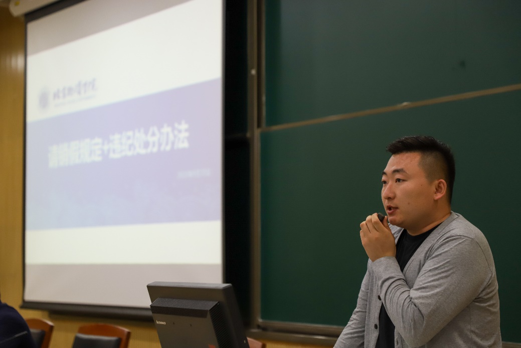 专职组织员张飚老师为新生讲解党员发展相关工作。张老师向大家介绍了发展党员的工作程序及不同发展阶段需要准备的材料,并鼓励同学们端正入党动机,提高政治觉悟,积极向党组织靠拢。