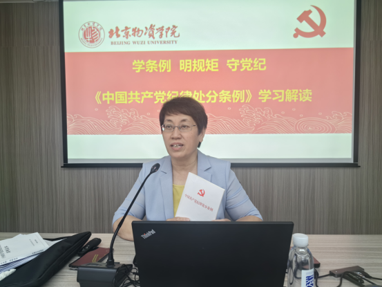 会上,学院党委书记刘艳荣重申了党纪学习教育的要求和内容,围绕学院党委和基层党支部开展党纪学习教育进行再强调。刘书记以理论学习“以学严行”的形式,结合自身学习思考,以《学条例、明规矩、守党纪》为题,从正确理解《中国共产党纪律处分条例》修订的背景意义、深刻把握《中国共产党纪律处分条例》修订的内容特点、深入学习《中国共产党纪律处分条例》内容并贯彻执行等三个方面,对新修订《中国共产党纪律处分条例》做了深入浅出的讲解。