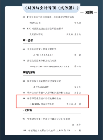 杨超老师指导的、以本科生王梓洋作为第一作者的论文《基于不同底层资产特征的基础设施公募REITs税收处理分析》,被《人大报刊复印资料》的《财务与会计导刊(实务版)》全文转载。该文原载于《财政监督》2024年第3期,通过对产业园区类和高速公路类REITs底层资产特征的分析,可以为税务实务和税务部门提供有针对性的税务政策建议。
