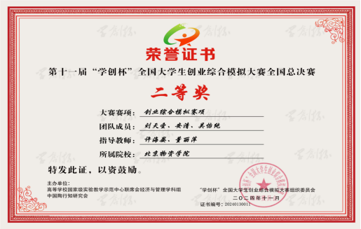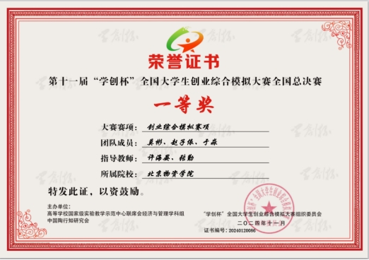 参加全国总决赛的队员莫彬(2221120009)、赵子依(2321140025)和于淼(2321240060)赛前精心准备,积极备战,在比赛中团结协作、理性决策,经过虚拟运营软件综合模拟和创业计划书两个赛项的激烈角逐,最终获得全国一等奖,另一个参赛队伍获得了二等奖,成员为:刘天圣(2221720002)、安清(2121360037)和吴怡纯(2121360031),指导老师许海晏、张勤和董丽萍获评“优秀指导老师”,为偷拍论坛