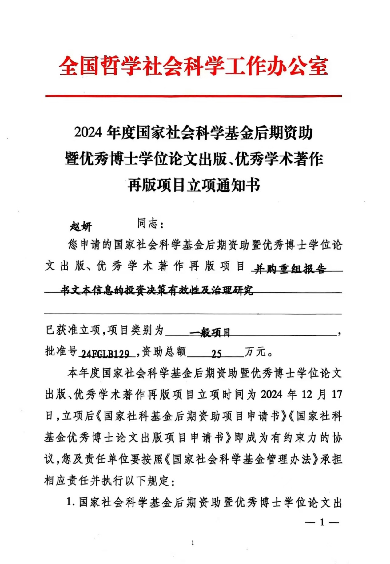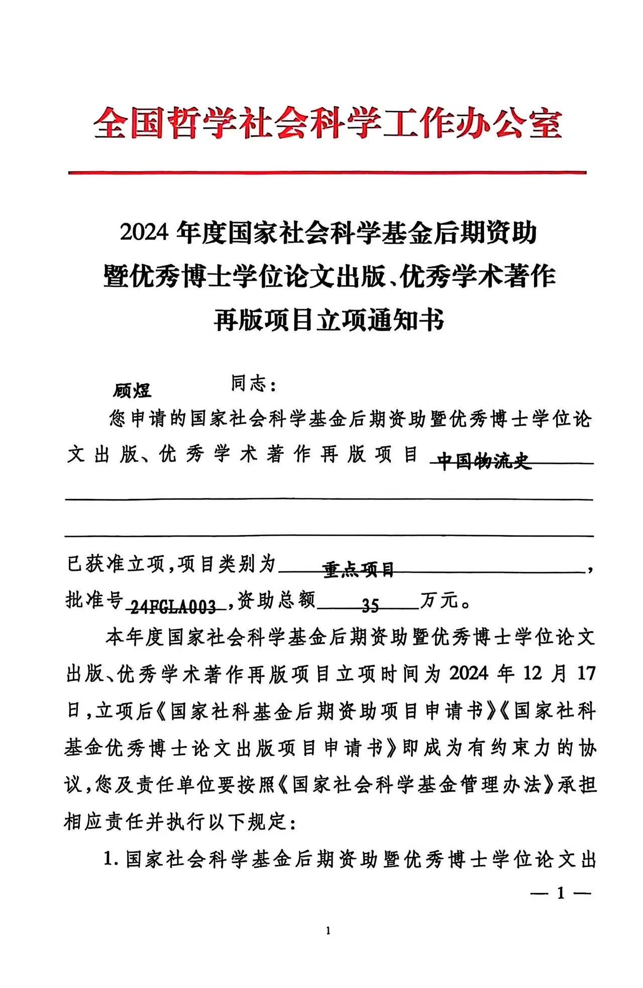 顾煜教授的《中国物流史》入选国家社科基金后期资助项目重点项目,青年教师赵妍副教授的《并购重组报告书文本信息的投资决策有效性及治理研究》入选国家社科基金后期资助一般项目。