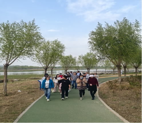 活动伊始,宋庄所讲解员为老师们讲解了宋庄蓄滞洪区水系、水闸的基本情况和蓄滞洪区建设情况。之后教职工们沿湿地步道徐徐前行,这片位于北运河北关闸以北7公里处的蓄滞洪区,是北京城市副中心防洪体系的核心组成部分,还兼顾了生态需求,保留了原有湿地、浅滩等自然地貌,正是一处集汛期安全、生态修复、自然景观与科普教育于一体的水景空间。行走间,老师们深切感受到,这座以“通州堰”理念构建的水利枢纽,不但是钢筋水泥的防洪屏障,更是人与自然共生的智慧结晶,此次徒步既锻炼了体魄,也进行了一场关于城市安全与韧性的生动课堂体验。