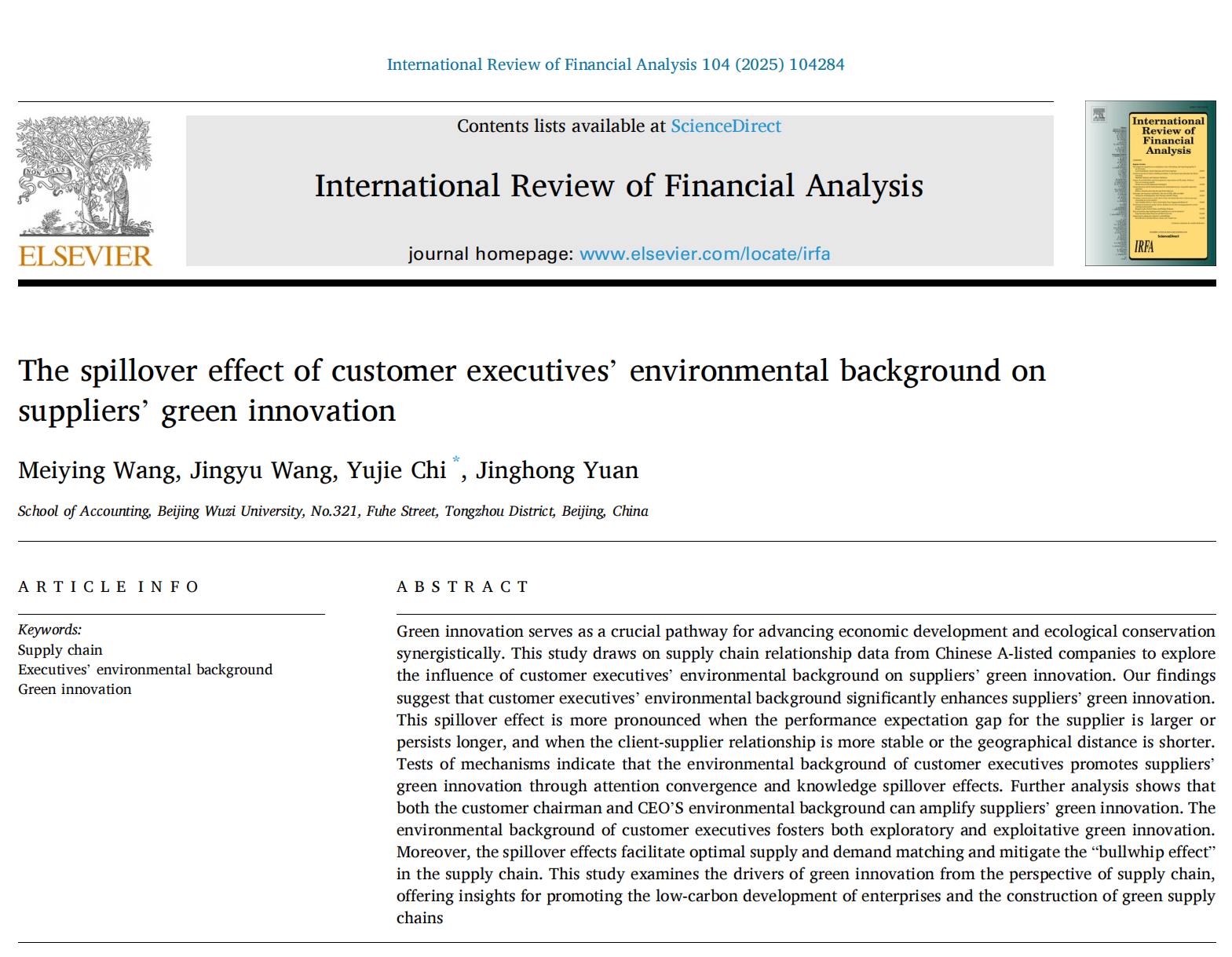 青年教师王靖宇老师(第二作者)等合作的学术论文“The spillover effect of customer executives' environmental background on suppliers' green innovation”在国际期刊《International Review of Financial Analysis》上录用发表。《International Review of Financial Analysis》系SSCI检索期刊,是JCR一区、中科院经济学大类2区Top期刊,最新影响因子为7.5,CiteScore值为10.3,属于国际权威期刊,该期刊是偷拍论坛