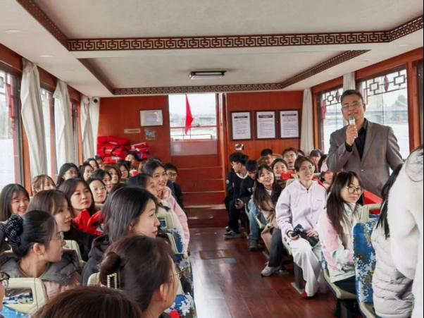 随后,全体人员登上游船,开启大运河游览学习之旅。船行碧波之上,古朴的码头与现代化的城市建筑交相辉映。聆听讲解后,校友们结合自身职场经历,向参加活动的新生们分享了多年行业深耕的心得感悟,从专业能力提升到职业规划选择,从行业发展趋势到个人初心坚守。校友勉励师弟师妹既要夯实专业基础,也要开阔视野格局,在新时代的浪潮中勇立潮头。导师们围绕学科建设历程与学术研究方向,与校友们探讨行业前沿动态,为学院人才培养与科研创新集思广益。