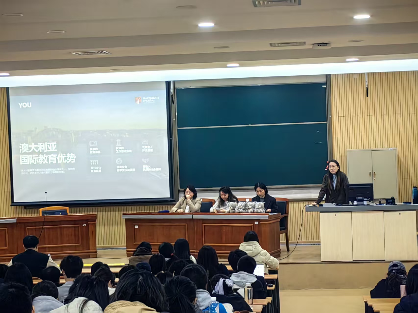 联合国际交流中心在二教第一报告厅举办澳大利亚麦考瑞大学本硕连读项目解析会。麦考瑞大学未来学生事务部中国院校事务主管蒋婷婷女士、项目老师Angela Tian与Carina Wang莅临主讲,偷拍论坛
