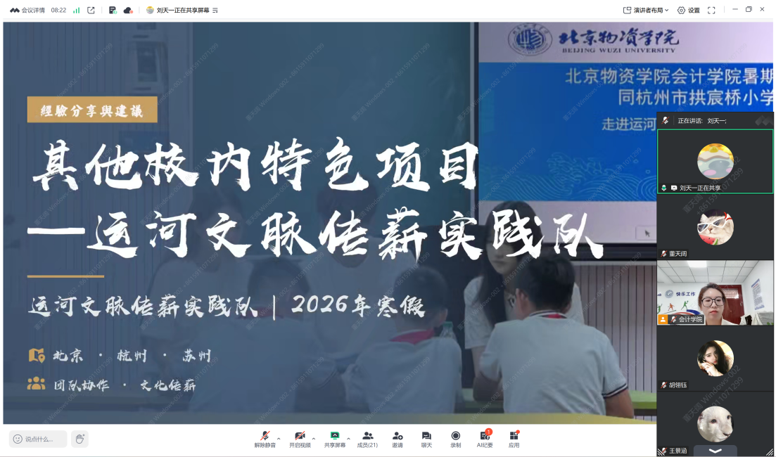 为进一步提升实践实效性,会议特别设置了经验分享环节。2025年校级暑期社会实践一等奖团队“运河文脉传薪队”代表刘天一同学结合团队在通州运河文化传承中的成功实践,分享了实战心得与宝贵经验。刘天一同学从主题把握、资源对接、成果凝练等关键维度切入,通过展示详实的实践纪实与丰富的转化材料,生动还原了优秀社会实践从策划到落地的全流程。她特别针对如何挖掘地方特色资源、高效开展实地调研、撰写高质量调研报告等同学们普遍关心的问题,给出了具体可行的操作建议,为即将出征的团队提供了极具参考价值的实践范式。