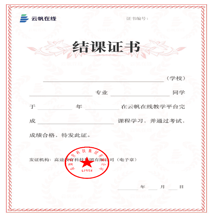 证书样例:完成以上线上云课学习并通过考试的同学,可以下载结课电子证书,证书样例如下。