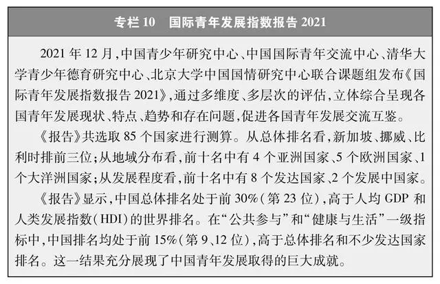 政策保障日益完备。针对中国青年多元化发展需求,国家强化政策服务导向,健全完善政策体系。国民经济和社会发展“十三五”和“十四五”规划鲜明体现青年元素,科教兴国、人才强国、创新驱动发展、乡村振兴、健康中国等国家重大战略充分关注青年群体,青年发展得到越来越多的顶层设计支持。2017年4月,中共中央、国务院制定出台新中国历史上第一个国家级青年领域专项规划——《中长期青年发展规划(2016-2025年)》,为新时代中国青年发展提供根本政策指引。针对青年在毕业求职、创新创业、社会融入、婚恋交友、老人赡养、子女教育等方面的操心事、烦心事,党和政府高度重视,各项政策举措持续出台,青年发展型城市建设蓬勃开展,青年优先发展理念日益深入人心。目前,从中央到地方的青年工作机制基本建成,具有中国特色的青年发展政策体系初步形成。青年充分享受政策红利,实实在在感受到关爱就在身边、关怀就在眼前。