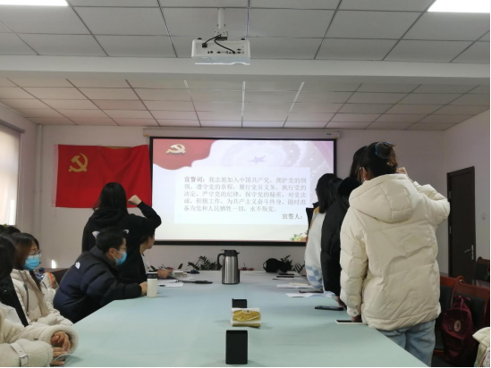 通过无记名投票的方式,支部全票通过七名同学发展为中国共产党预备党员。党支部全体党员进行党章学习,七名预备党员面也向党旗进行了庄严的宣誓。最后,奏国际歌。
