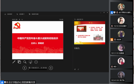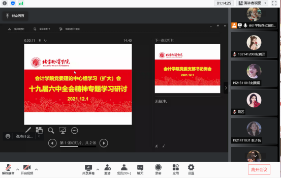 为深刻把握党的百年奋斗重大成就,深刻领会党百年奋斗的历史经验,会计学专业学生第二党支部于2021年12月1日在线上开展主题理论学习,主题为十九届六中全会精神学习研讨,支部全体党员和积极分子共同参与。