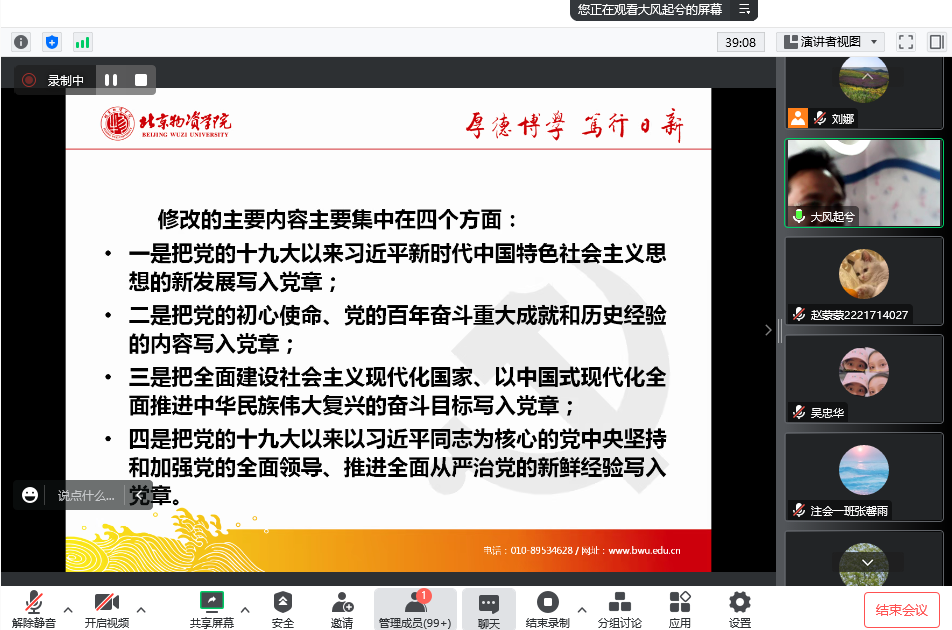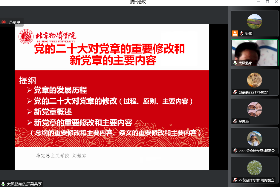 刘耀京教授以《党的二十大对党章的重要修改和新党章的主要内容》为主题,从“党章的发展历程”、“党的二十大对党章的修改”、“新党章概述”、“新党章的重要修改和主要内容”四个方面展开讲述。