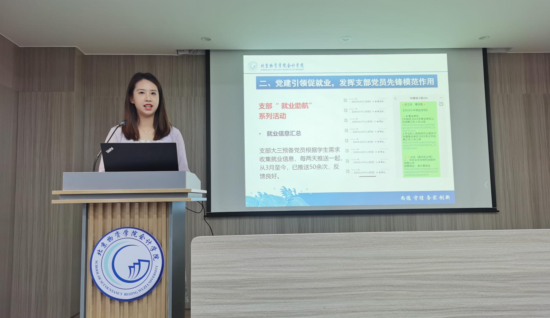 学生第四和第六党支部促进就业工作经验。王鹏莉老师首先介绍了两个支部2023级毕业生就业基本情况,目前两个支部学生就业率和党员就业率在学校名列前茅。王老师从党建引领促就业,发挥支部党员先锋模范作用;多方力量联动,辅导员、班主任、系主任、包干领导协同发力;依托学校学院资源,精准帮扶促就业等三个方面向老师们介绍了如何高质量推进毕业生就业工作。王鹏莉老师的讲述以数据支撑娓娓道来,在就业推进的关键时期提供了可借鉴的方法。
