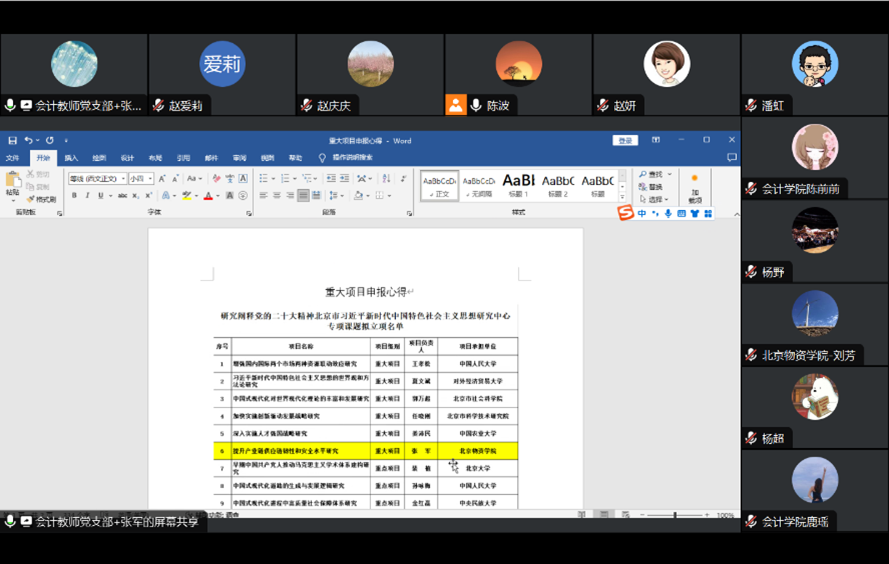 会计学专业教师党支部的党员论坛着眼思想引领,推进思政教育与教学科研有机融合。结合学院月学习计划,采取线上线下相结合的方式,将党建和课程思政、教学科研、专业建设一体融合,每月一个主题,引导师生“大讨论”,采取“政治学习赋能业务学习”的形式,抓好专业课中的思政教育,不断激发全系教师的科研灵感和创新活力,也促进科学研究取得成效。在去年主题教育期间,张军教授申报的北京市习近平新时代中国特色社会主义思想研究中心重大项目《提升产业链供应链韧性和安全水平研究》获得立项。今年新学期伊始,也是国家课题申报季,会计学专业教师党支部围绕课题申报开展论坛交流,促进科研项目申报及科研工作顺利开展,鼓励党员在科学研究中发挥模范带头作用。