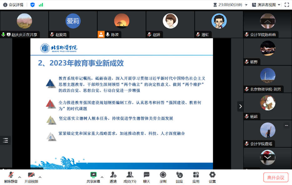 在党课学习环节,赵庆庆老师作为导学人,为全体党员深入解读了“2024年全国教育工作会议精神”。赵老师结合当前教育领域的热点问题和未来发展趋势,对会议精神进行了全面而系统的解读。她讲到,作为教育工作者,我们要紧密围绕国家教育政策,不断提升自身的教育教学水平和科研能力,为培养更多优秀人才贡献力量。