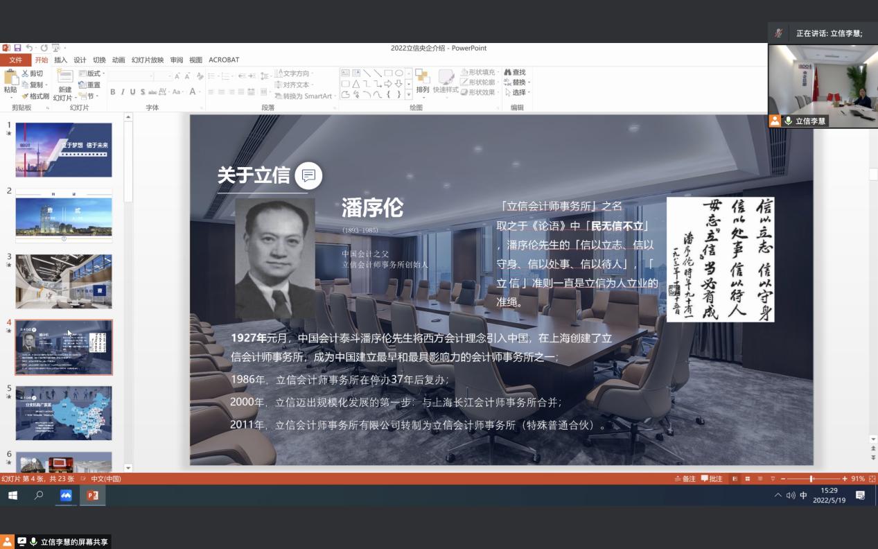 与会人员共同收看了立信会计师事务所及立信央企事业总部的企业宣传片。人力资源部经理刘薇娅对立信会计师事务所以及立信央企事业总部的发展历史、主营业务、当前发展规模和偷拍论坛等作了介绍。特别介绍了每天接收学生进行实习和就业的情况,以及在事务所工作中的人才培养和发展通道。