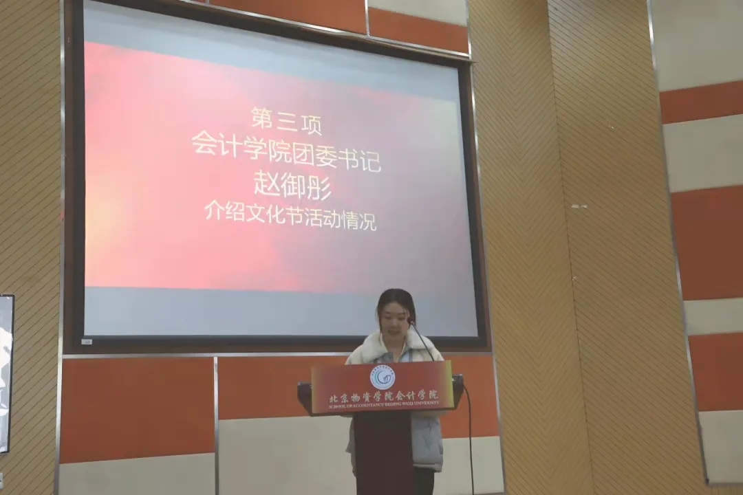 团委书记赵御彤老师对本次会计文化节的系列活动进行了简单介绍。在之后的活动中,希望同学们展现当代大学生精神风貌。赵老师还指出在接下来的会计文化节中,还会开展更多会计专业相关的活动。
