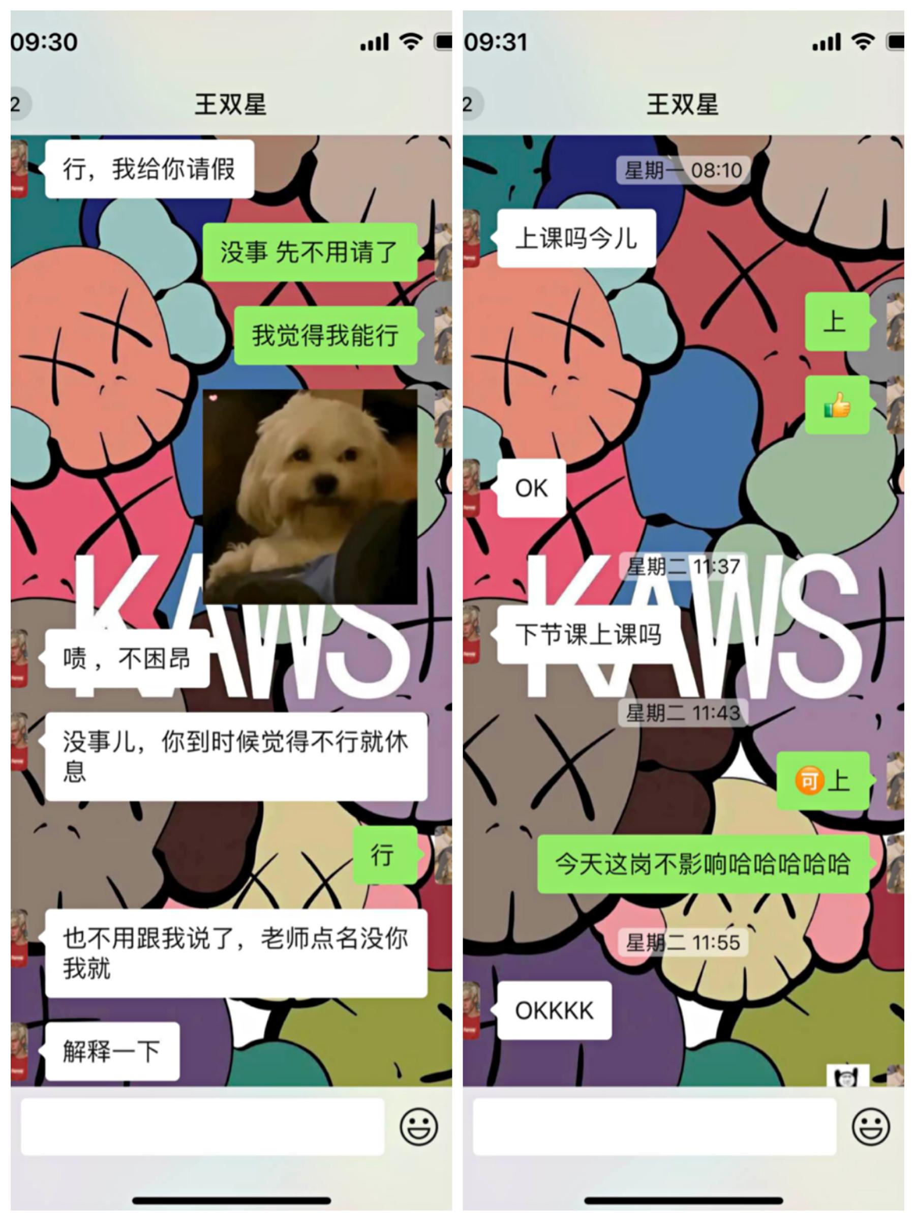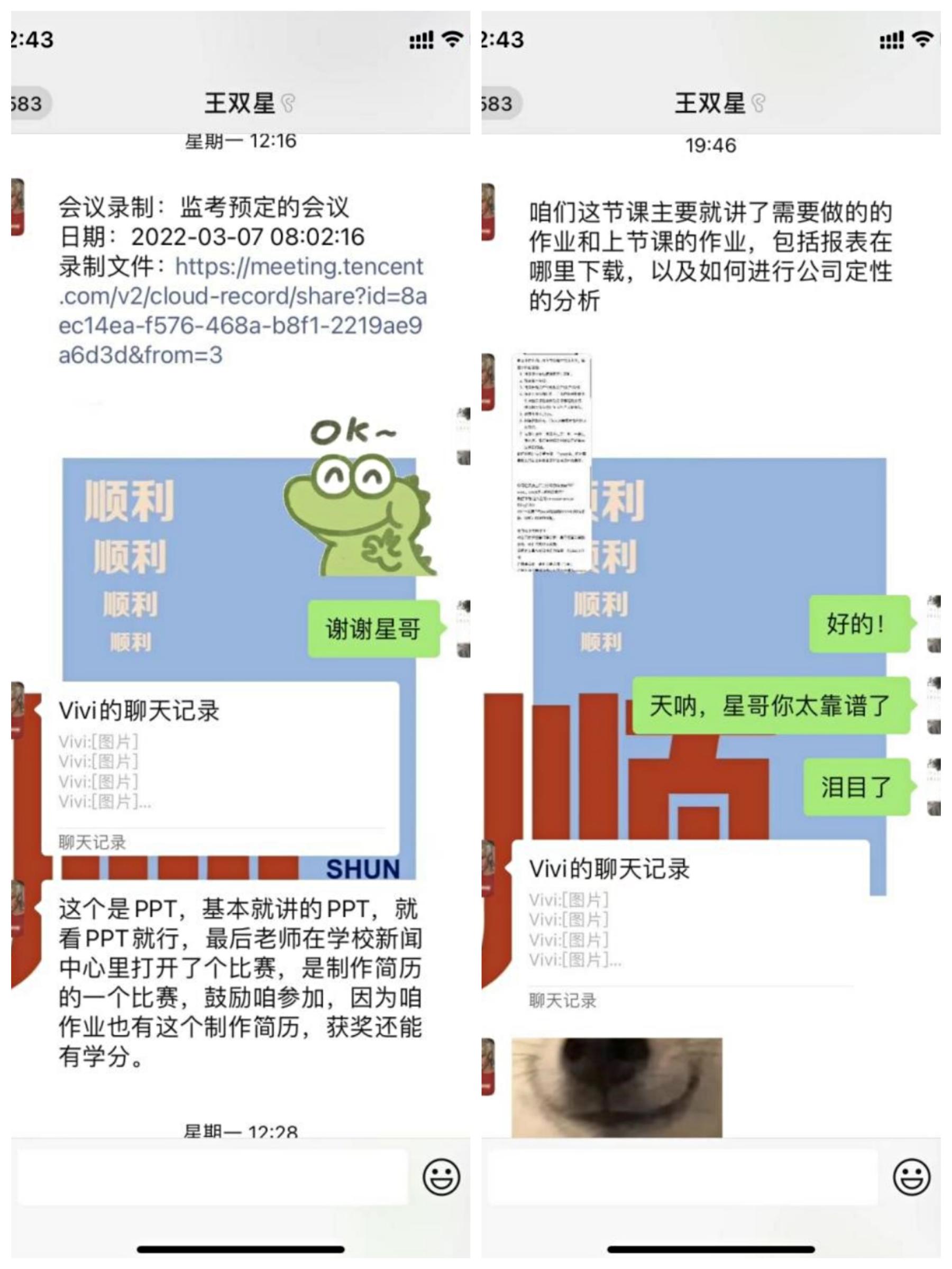 因为我本学期基本都是选修课,所以课业志愿者有三位同学,都是我们同专业的朋友,她们每次都会在课前问我需不需要帮忙,如果我在上岗,她们也会私聊老师说明我的情况,课后及时把笔记和录课视频传给我,因为有她们的默默支持,我没有错过一节。