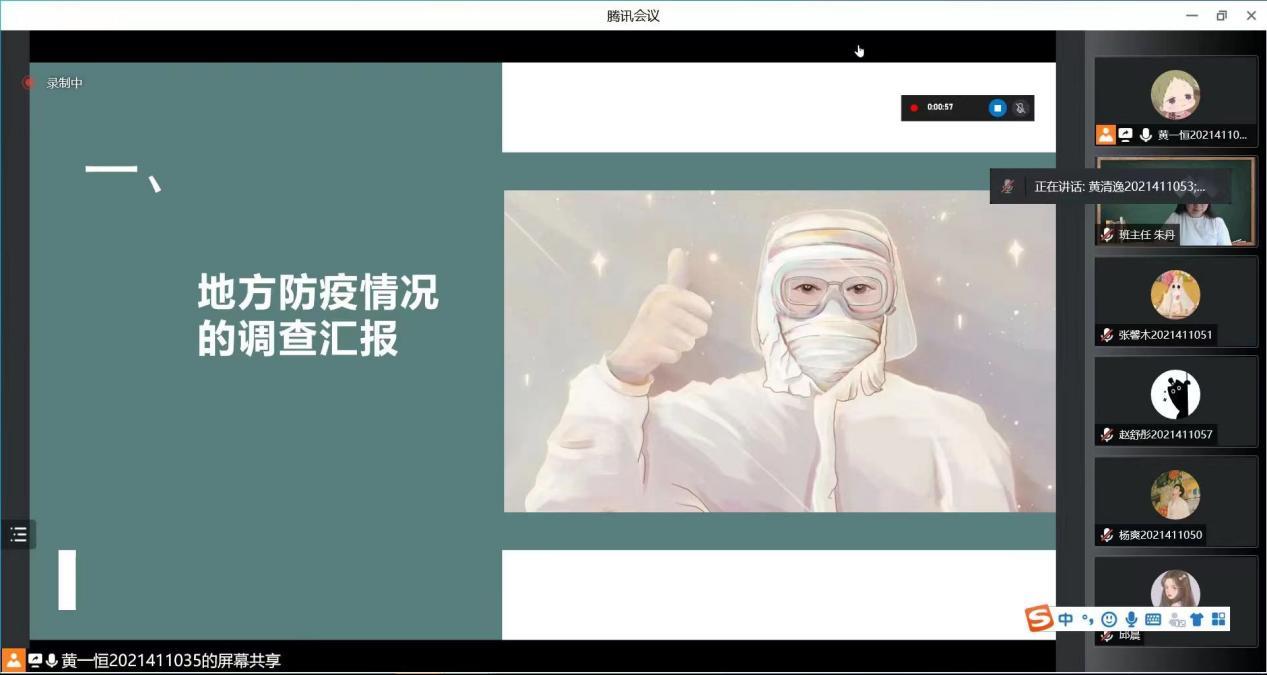 随后进行班会第二部分,由张馨木、马清怡、郭雨欣、邱晨和唐玉涵这5位同学分享了自己的抗疫故事和志愿者事迹。其中张馨木和马清怡同学分别位于当前疫情十分严重的北京房山区和海淀区,这两名同学讲述了社区、村的防疫措施。48小时核酸证明已经是“家常便饭”,加强人员管理、防疫政策宣传工作,防疫措施在不断从严从紧,势必守好基层疫情防控的第一道防线。随后在郭雨欣同学的发言中,她的母亲通过培训成为了一名核酸检测人员,这也深深激励了自己自愿参加抗疫服务,成为了一名光荣的志愿者,正如她所说:“要做抗击疫情的‘排头兵’!”其次邱晨同学介绍了家乡天津市独特的抗疫宣传工作,医务人员和志愿者将防疫工作结合地方特色,通过幽默诙谐的方式宣传防疫知识和措施,不仅提高了工作效率,也加强了天津人民的凝聚力,万众一心,共抗疫情。最后由唐玉涵同学讲述了自己作为一名“大白”的经历。在假期中,为了帮助家乡抗击疫情,充实自己的假期生活,唐玉涵同学很荣幸成为了一名社区防疫志愿者。在这段时间里,由于防疫要求他不能回家,吃住由社区统一安排,每天凌晨4点穿好防护服,为居民们测温,组织居民们做核酸。在工作中难免会遭到居民的不理解,他也耐心宣传防疫措施,安慰居民情绪。这份工作异常的辛苦,难受的防护服、庞大的工作量、群众的不理解,这些困难都让这段经历变得尤为可贵,充实且有意义。