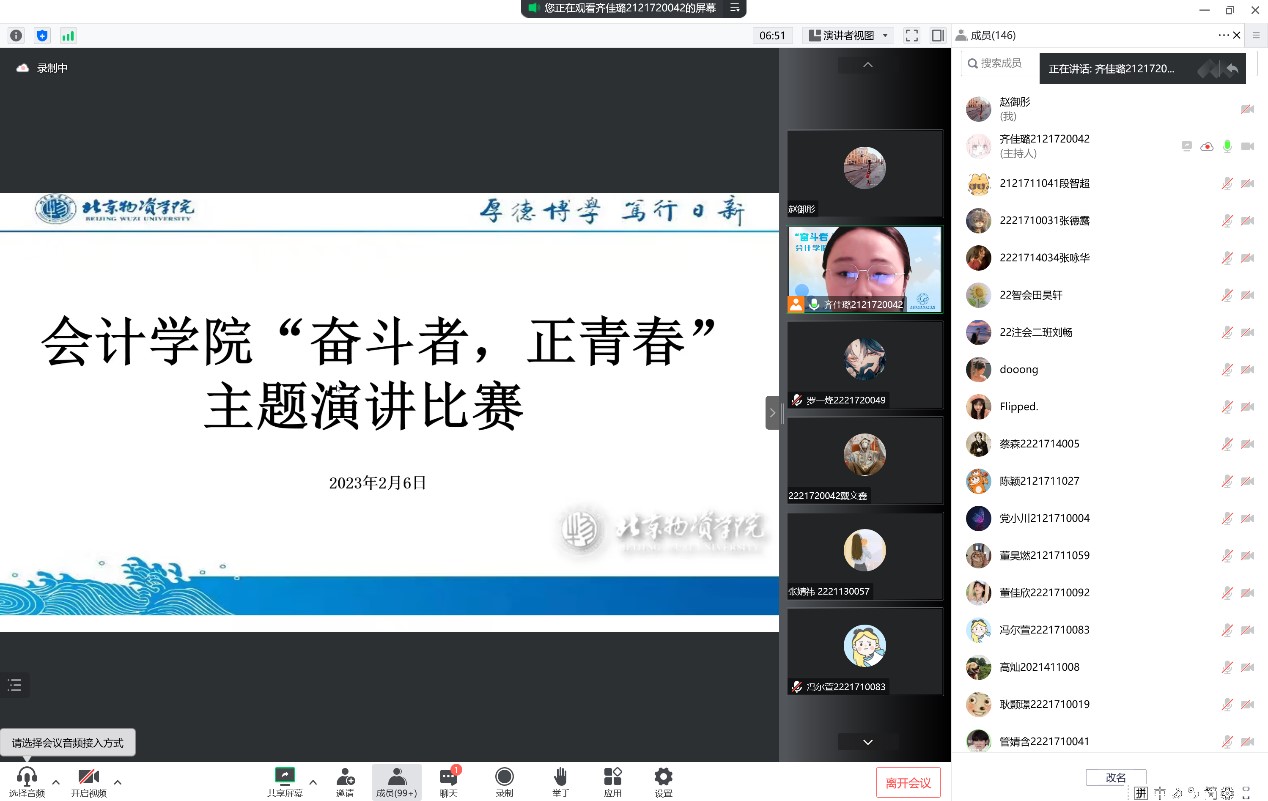 2023年2月6日在腾讯会议平台开展“奋斗者,正青春”主题演讲比赛。