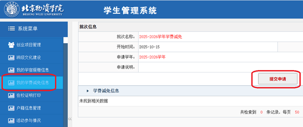 申请人登录学生管理系统,在“我的学费减免信息”栏填写申请信息并提交申请,并将相关证明材料复印件提交至科研楼311梁老师。