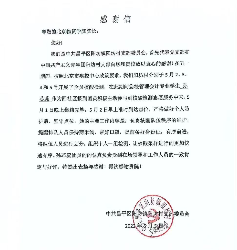 20级管会二班的孙芯蕊同学居家学习期间主动加入到防疫志愿服务中,在核酸检测志愿服务坚守点位、尽职尽责,受到了在场领导和工作人员的一致肯定和好评,学校还收到了社区所在党支部的感谢信。